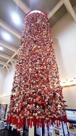 クロステン十日町のおみやげ館内に展示されている【幸せを呼ぶ傘つるし雛】は、過去ギネスにも登録され世界一になったこともある吊るし雛で、その数は10,000個以上にもなります。