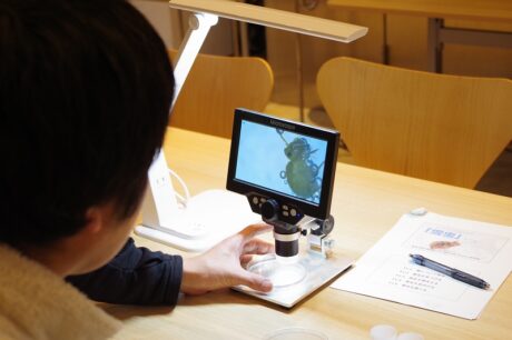 昼食をはさみ、午後は顕微鏡を使って体の細部まで観察しました。「めっちゃ毛が生えてる」「この突起は何!?」など、肉眼では見えなかった体の構造に気づくことで、雪虫の進化や生態についての理解が深まります。