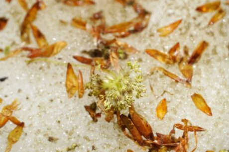 強い風が吹いたため、ブナの花も雪面に多く落下しています。
