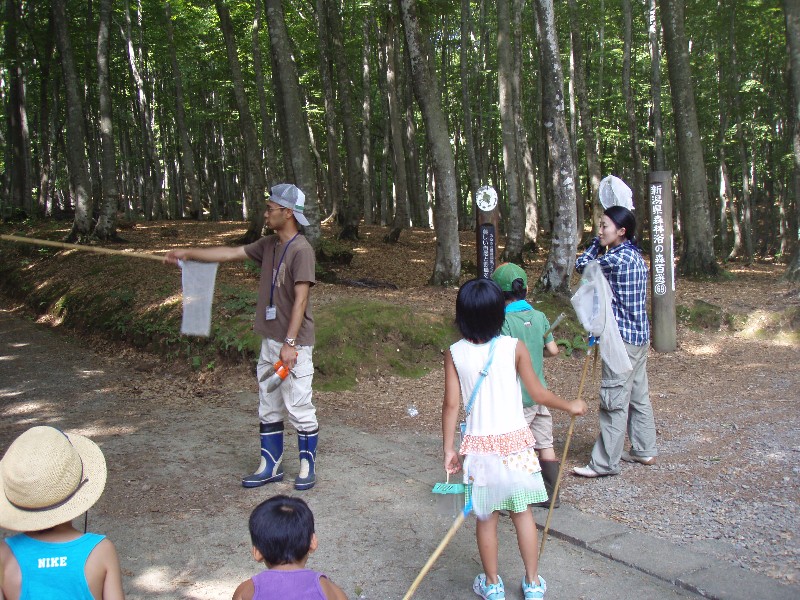 流れとしては通称「裏美人林」と呼ばれるブナ、コナラなどの樹木の生育する林を散策し、最後に小さな池で生き物観察をしました。