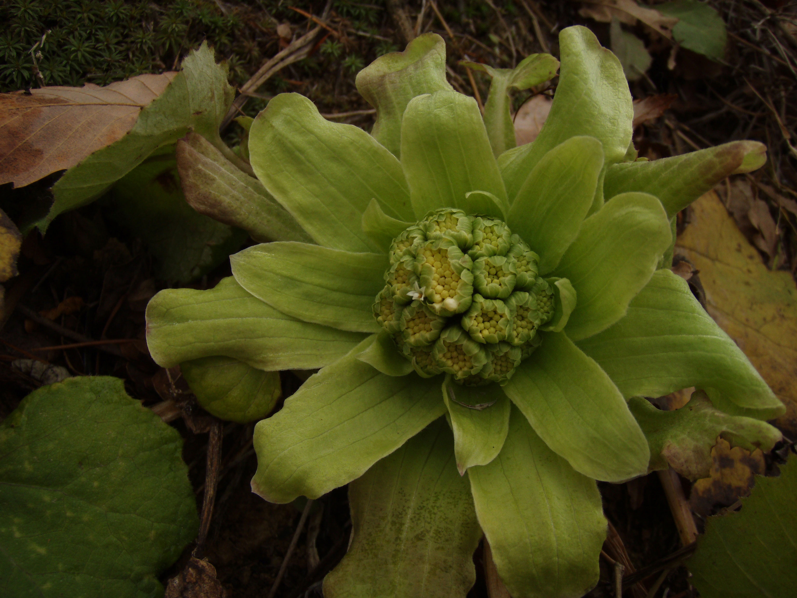 冬支度の傍らで、季節はずれのフキノトウが咲いていました。
