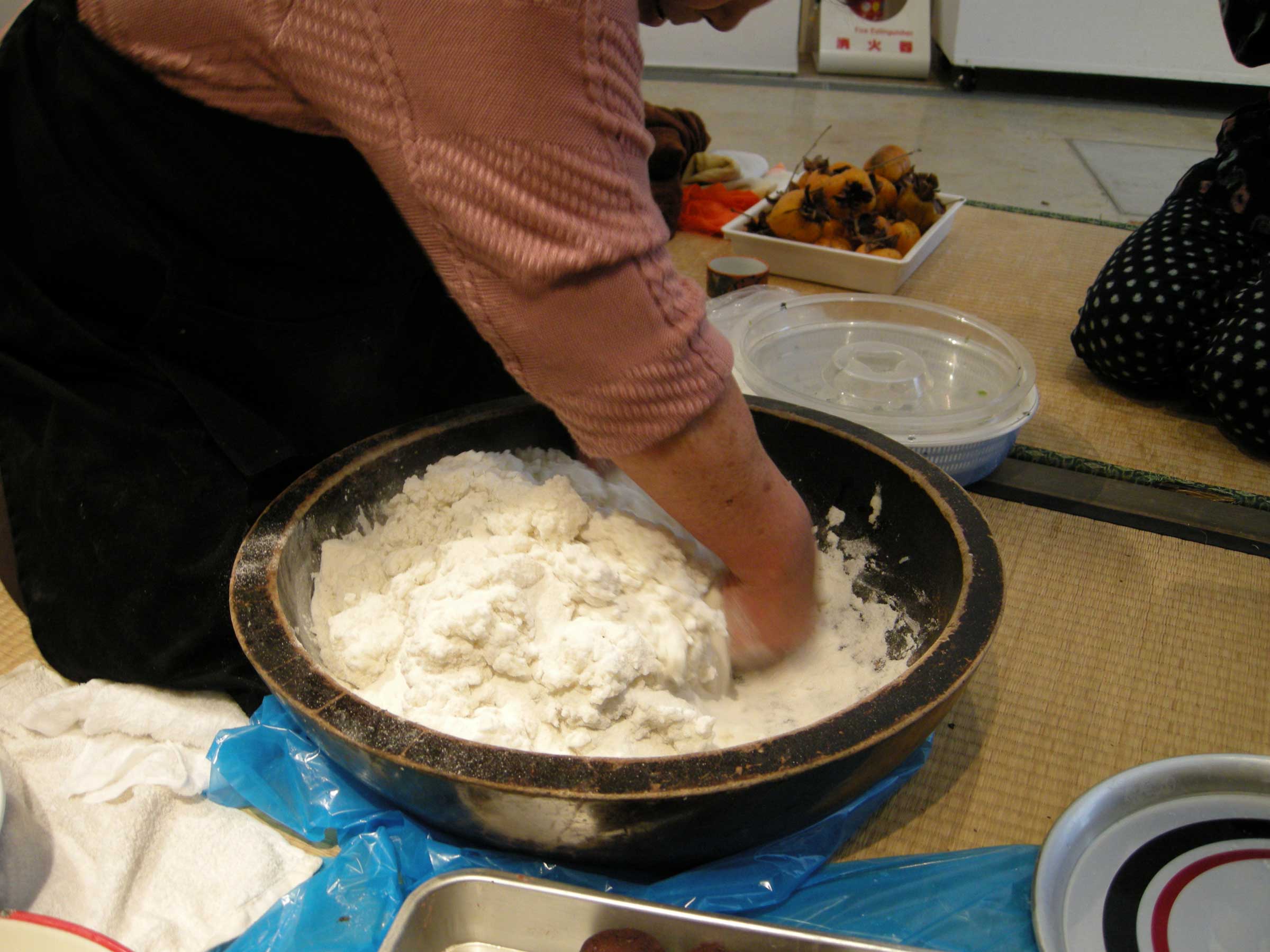 桜の木でできた大きな器(この器は先生が家から持ってきてくれましたが、100年以上使ってるそうです)に米粉2升と炊いたお米8合をいれ、まずすりこぎ?で簡単に混ぜます。