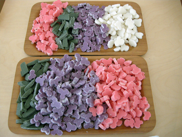 昨日作っておいた花餅を切ると、このようになります!一部ミッキーマウスっぽいですね。