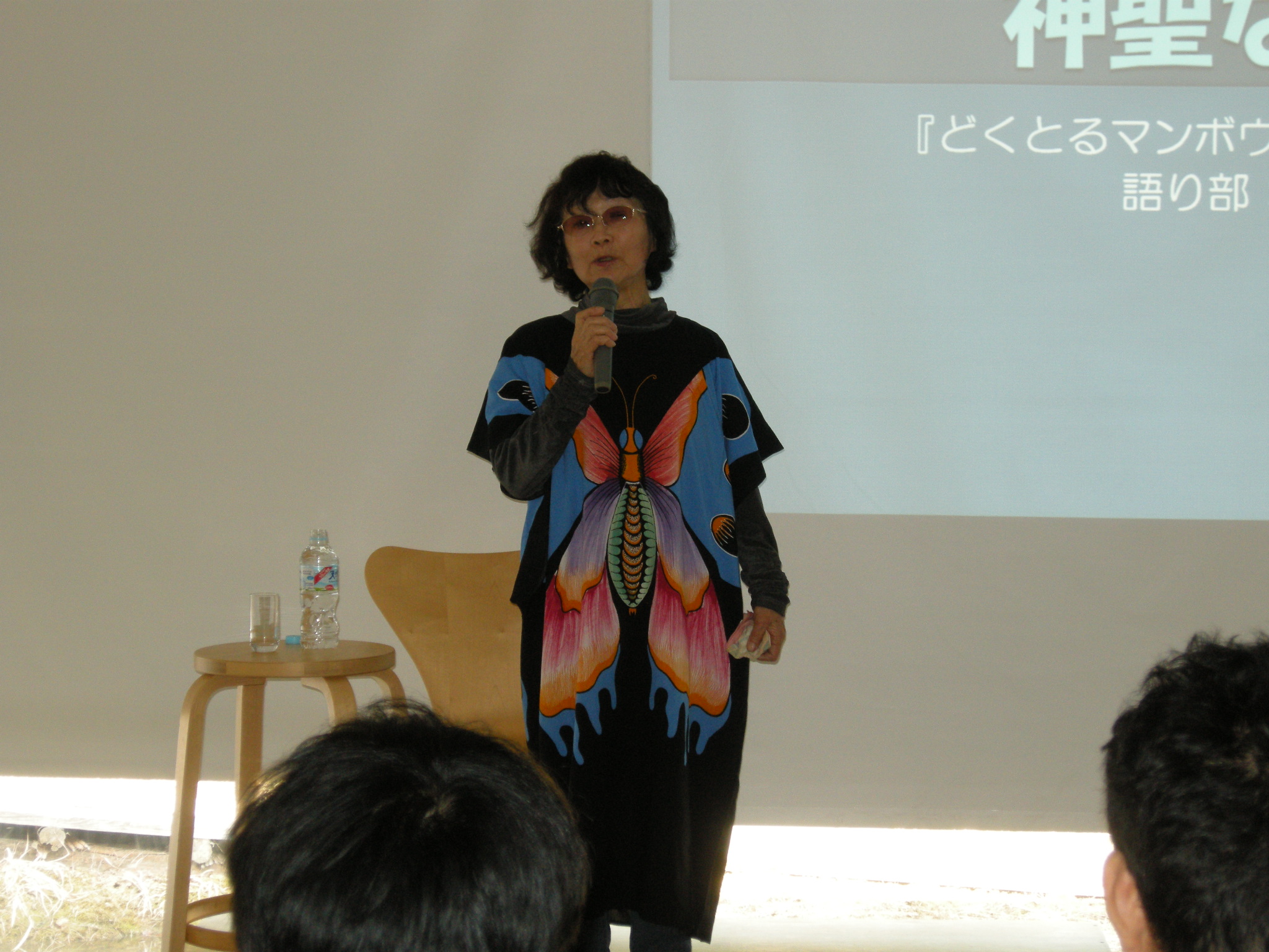 続いて「どくとるマンボウ昆虫展」開催を記念して「どくとるマンボウ昆虫記語り会」が開催されました。北杜夫さんのエッセイ『どくとるマンボウ昆虫記』を、語りべの伊藤しのぶさんに語っていただきました。