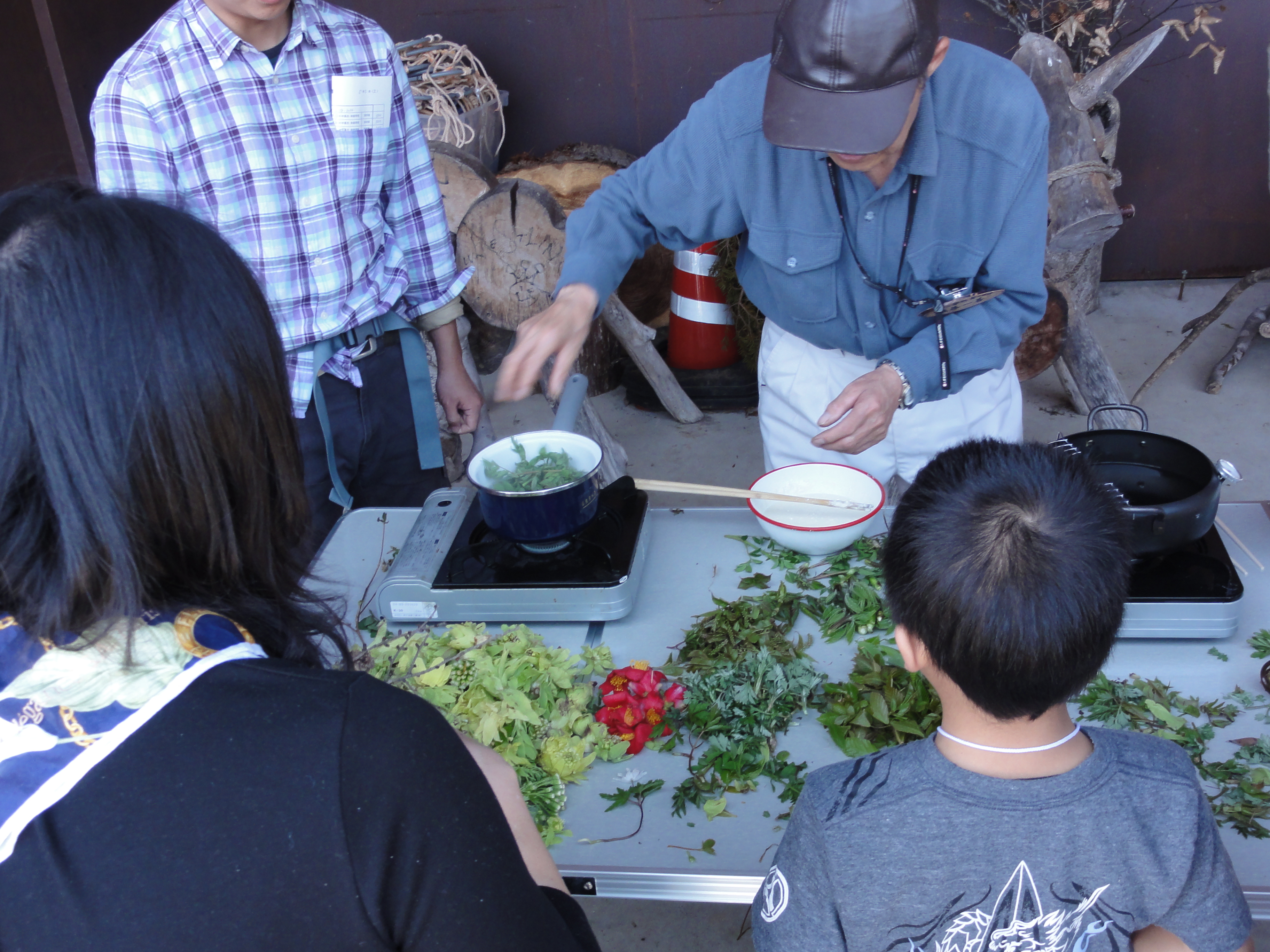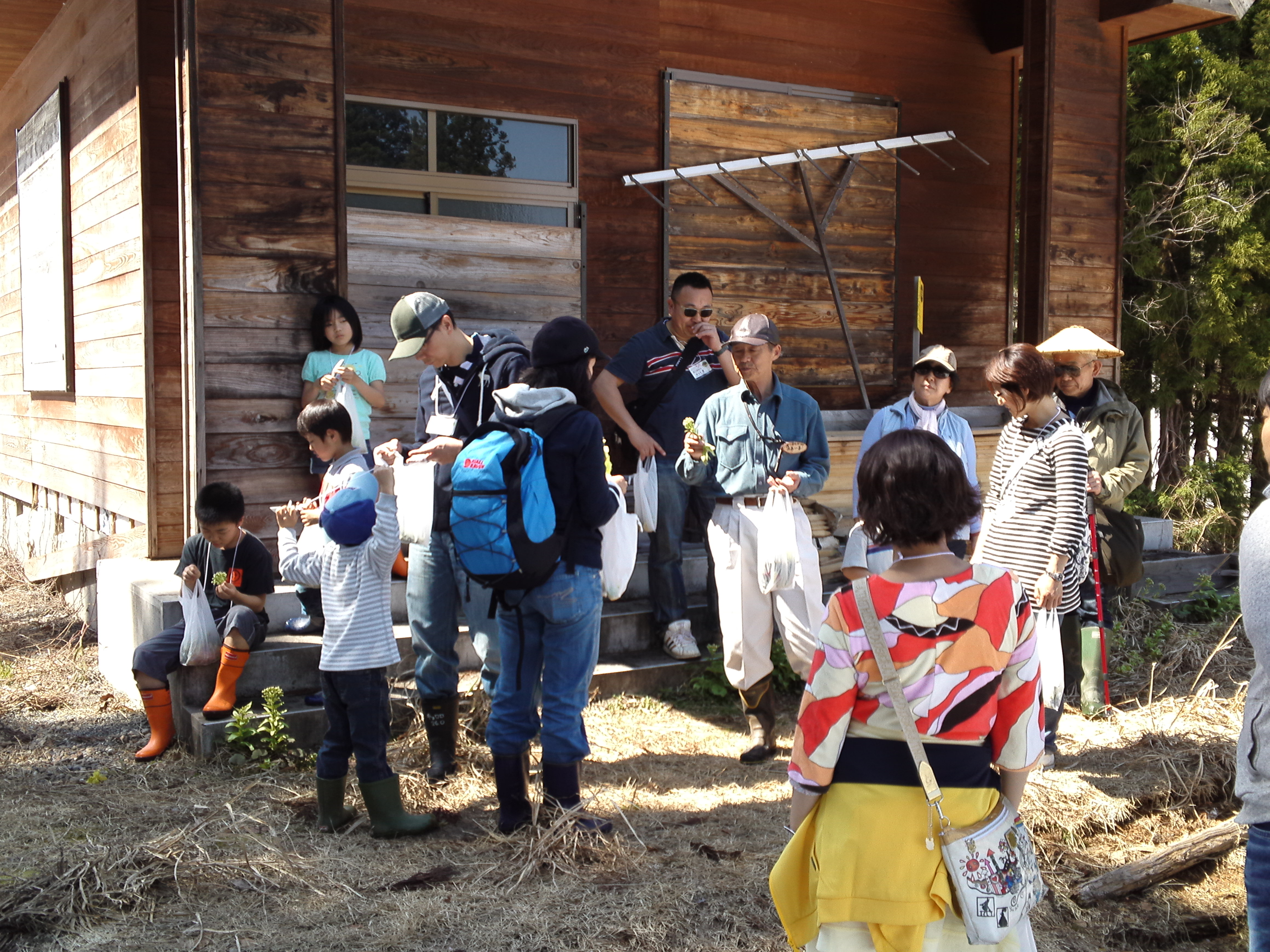 集めた山菜はキョロロの玄関前でテンプラにしたり、茹でてお浸しにして食べました。