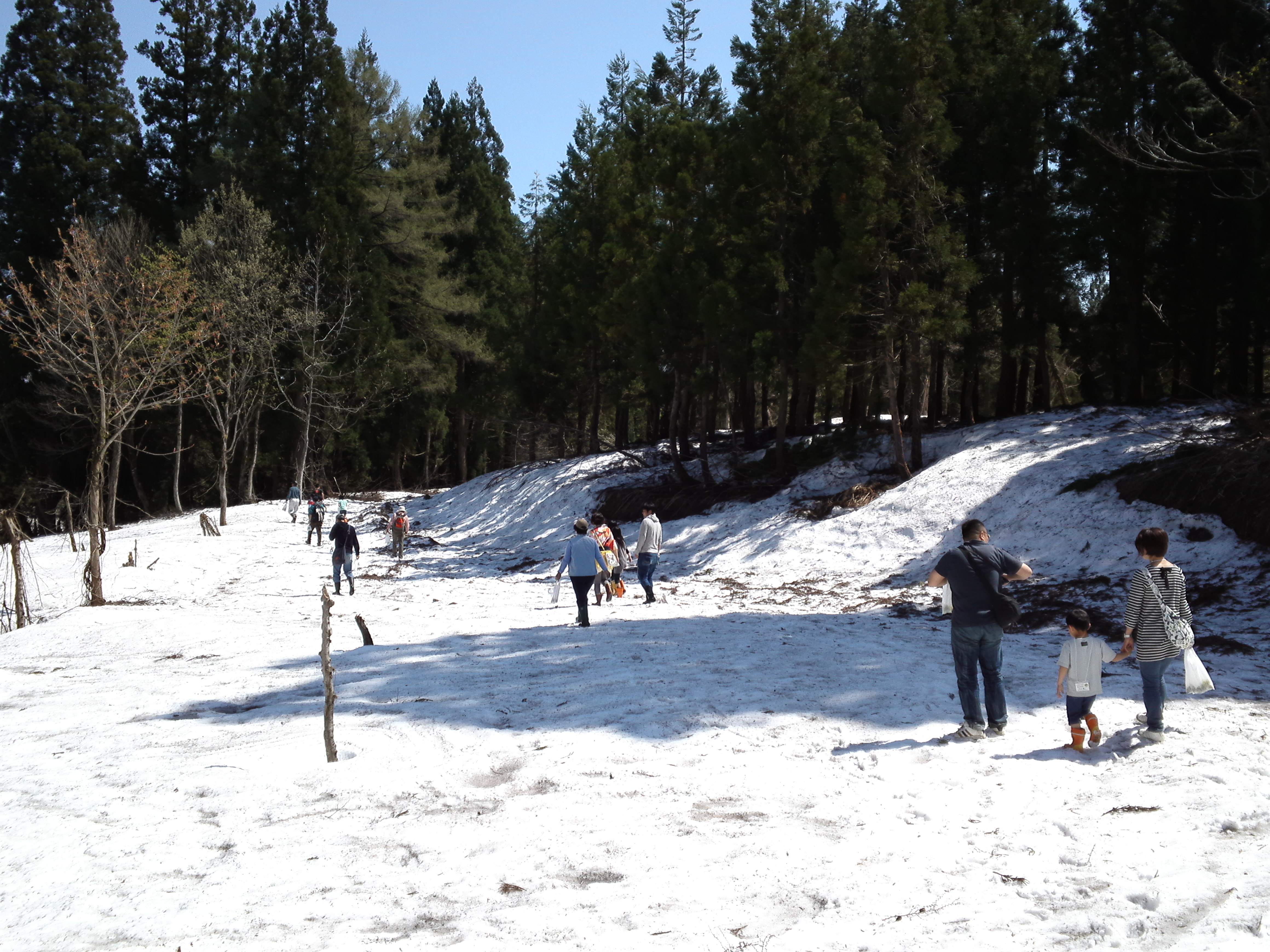 参加者の皆さんは一善さんの指導のもと山菜を採りながら残雪の上を進みます。