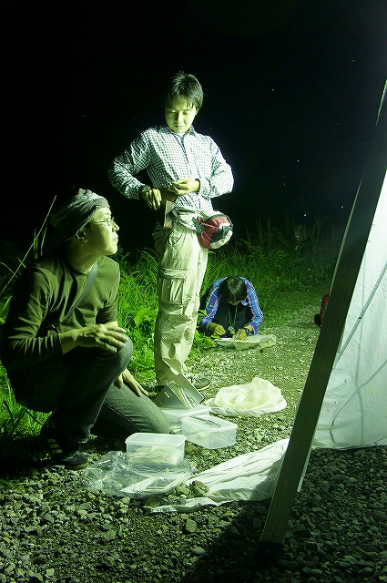 ライトトラップの前で蛾を待つ樋口さんと、キョロロの鶴さん、伊藤さん。