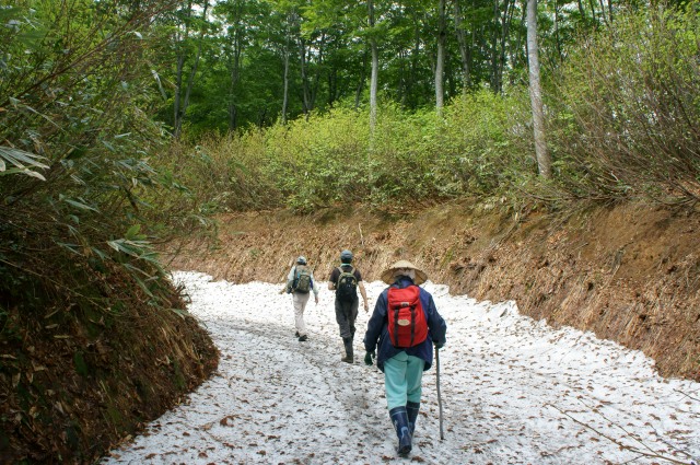 松之山口の周辺では、なんとまだ残雪が!足に感じるこの感触、久しぶりです。