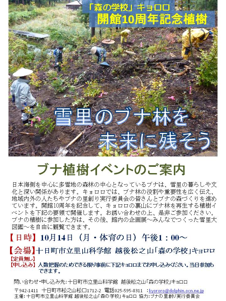 この度、キョロロ開館10周年を記念して、キョロロの裏山にブナの苗木を300本ほど植える植樹イベントを下記のチラシのように計画しています。参加費は無料です。開始15分前までにキョロロにお集まりください。なお、長靴を用意してきてください。雨天でも実施します。また、12日からは企画展「みんなでつくった雪里大図鑑」を行っています。十日町市民は、12日から20日までは無料で入館できます。
