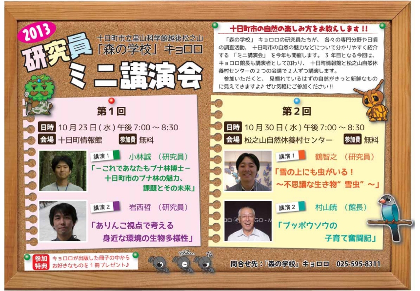 日曜日, 10月 20th, 2013昨年まで好評だったキョロロ研究員のミニ講演会を今年も開催します。3年目を迎える今年は、研究員だけでなくキョロロ館長も講演者として加わり、各々の専門分野の話や日頃の研究・調査活動、十日町市の自然の魅力などについて楽しく、分かりやすく紹介します。また、今回は十日町市情報館と松之山自然休養村センターの2つの会場で、2人ずつ講演を行います。詳細は以下の通りです。