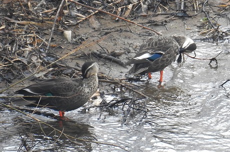 川岸ではカルガモが羽繕いをしています。
