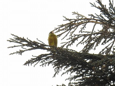 スギの梢で盛んに囀るカワラヒワ