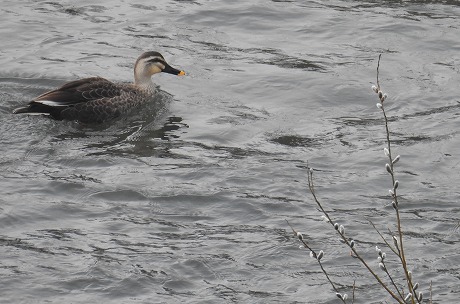 ネコヤナギ類の芽が膨らんでいる岸辺を泳ぐカルガモ