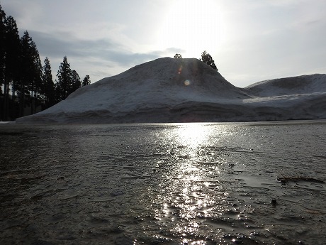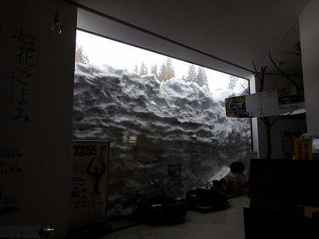 キョロロ受付の窓の雪も下だまり、隙間が徐々に大きくなっています。