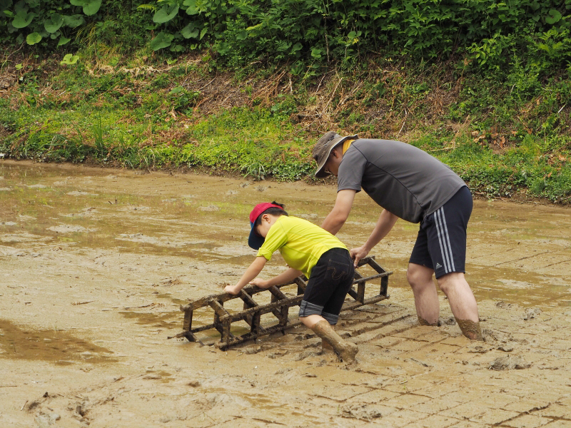 昔ながらの田植えの道具を使って苗を植える線も引きました。