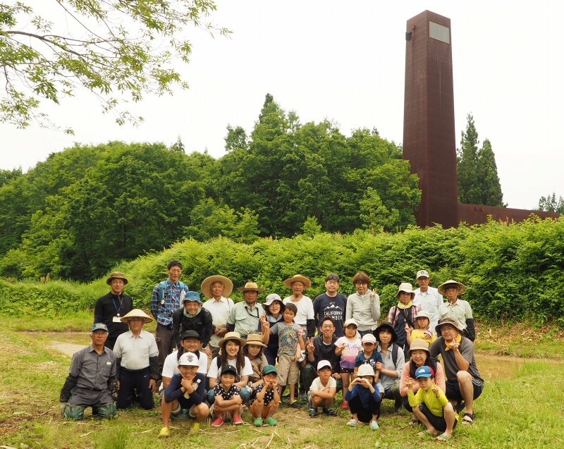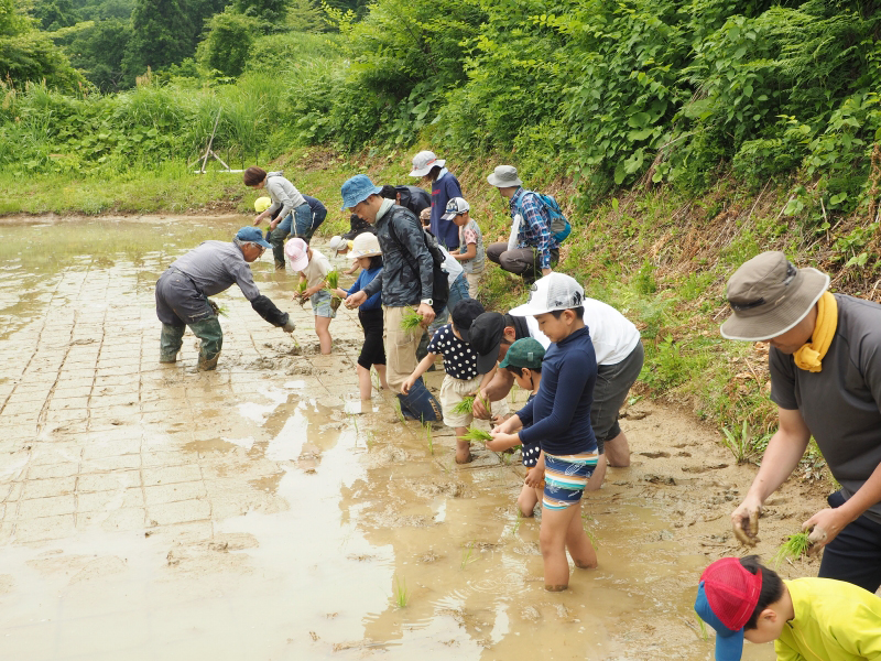 地域の方々やご家族連れの皆様からご参加いただき、メダカやカエルが泳ぐ生きものいっぱいの田んぼで田植え体験を行いました。