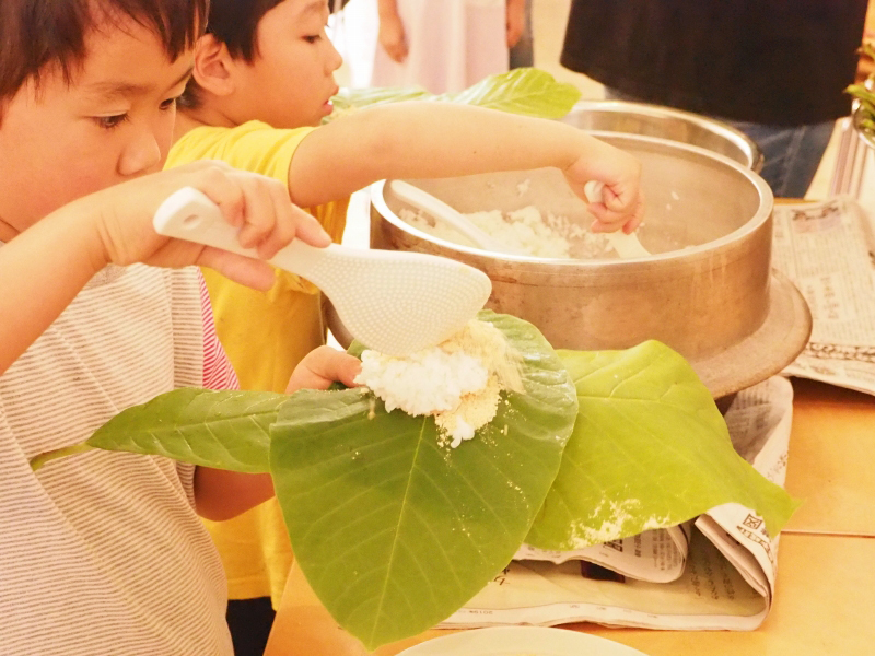 田植え修了後は、ぬか釜で炊いたご飯をきな粉を敷いたホオノキの葉っぱで包んだ「ホオの葉まんま」で慰労しました。