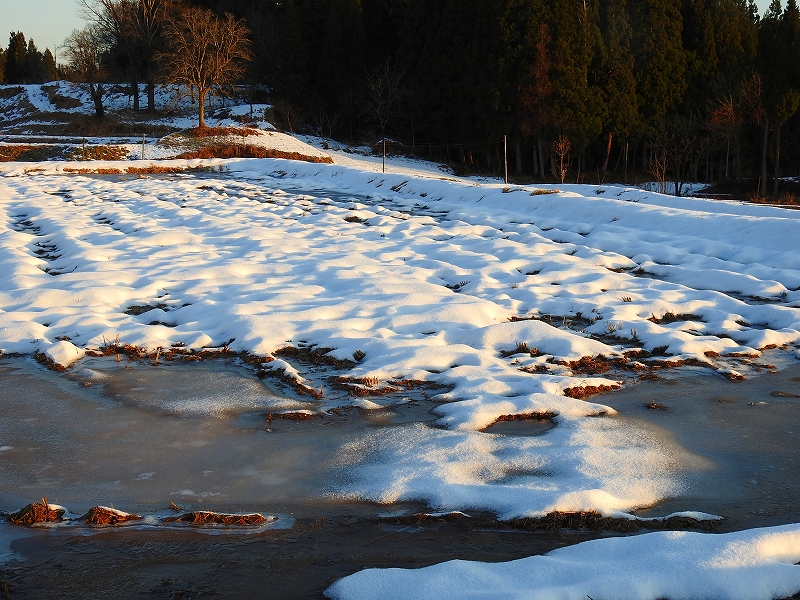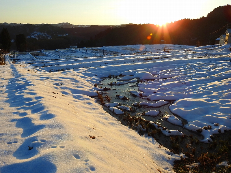 快晴の松之山方面に有明の月が輝き、師走ではありますがよい一日が始まる気配を強く感じました。