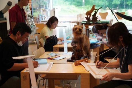 雨っぷりの天気で午前中の観察会をどうしようか悩んでいたところ、舘野さんのご厚意で、スケッチ教室を開催することになりました。題材はキョロロ所蔵の標本や剥製です。皆さん描きたい題材を選び、色鉛筆をつかってスケッチしていただきました。そして、なんと、舘野さんだけではなく、なかの真美さん、近藤えりさん、かわしまはるこさんにも加わっていただき、なんと絵本作家4名による豪華なスケッチ教室です。さらに、参加された方は舘野さんにリクエストをして一枚絵を描いてもらえる!というプレゼント付き。すごい!のほかに言葉が出ません。