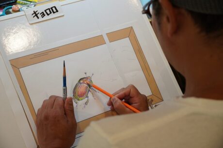 ▲参加者からリクエストされたオオセンチコガネを描く舘野さん