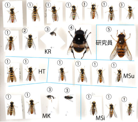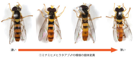 今回最も多く採集されたミナミヒメヒラタアブは、腹部の模様の変異が見やすい種の一つです。黒い縞模様が完全なものから、その縞の大部分が薄れているものまで様々な段階の個体が見られます。ハナアブの腹部の模様の個体変異については、松之山でもよく見られるホソヒラタアブの研究例があります。ホソヒラタアブは蛹の時期の気温によって腹部の模様が変わり、気温が低いほど黒い模様が大きくなるというものです(Dušek &Láska, 1974)。また実際に晩秋~冬と早春に見られるホソヒラアブでは、黒い模様の大きい個体が多いとされていて(祝,1997)、松之山でもこの現象を確認しています。ミナミヒメヒラタアブも成虫発生期間が長いので、しっかり調べてみるとこのような模様と季節の関連性が見られるかもしれません。