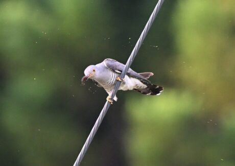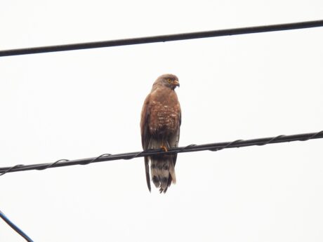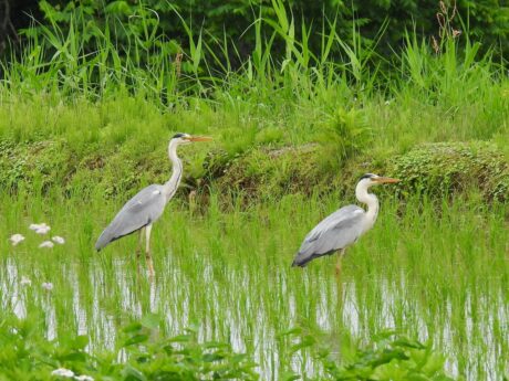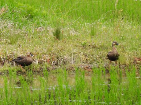 朝から雨になり、集合は学園のピロテイ。群馬県からもご参加いただきました。出発して間もなくプール脇にハクセキレイの番とキセキレイが現れました。ツバメは一回目のヒナが巣立ち、田んぼ周りにハクセキレイがしきりに飛び交っていました。こちらもひながかえっているようでした。キツツキ類もドラミングとケッケッという地鳴きをしていますが、識別はできませんでした。アオゲラは一声ピョーと鳴いてくれました。カッコウ、ホトトギスが鳴き、初夏の様子を醸し出していました。カラ類もヒナが孵り、賑やかな夏の探鳥会でした。