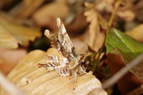 前翅の先にぼやけた白い紋があるのが特徴ですが、模様の個体変異が激しいので、わかりづらい個体もいます。