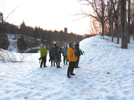 キョロロの塔をバックに凍み渡りをしながらの探鳥会