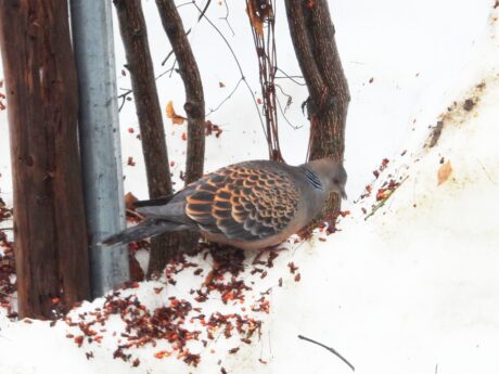 コマユミの落ちた実を食べるキジバト