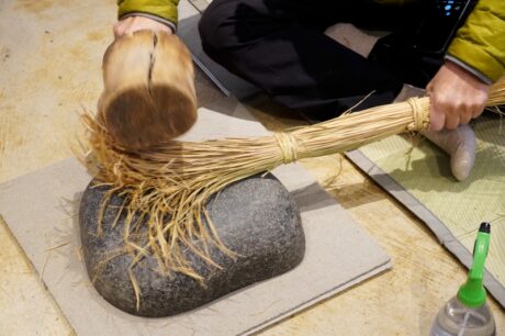 次に藁を綯いやすいように、藁をたたいて柔らかくしていきます。