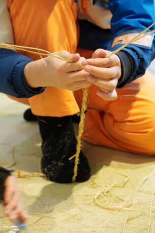はじめは苦戦してた子どもたちも、徐々にコツをつかみ、もくもくと藁を綯っていきます。