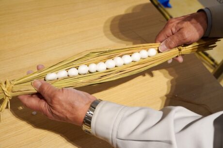 集落ごとにワラツトッコに入れるカラコの大きさや数が違い、キョロロでは小さく丸めたものを12個入れる松之山浦田地区のスタイルで行っています。