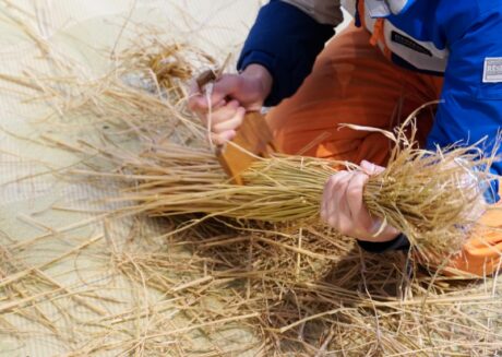 藁2本ほどを右手左手それぞれに持ち、合わせた手のひらで転がしながら撚りをつけ、藁を綯っていきます。