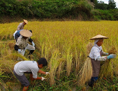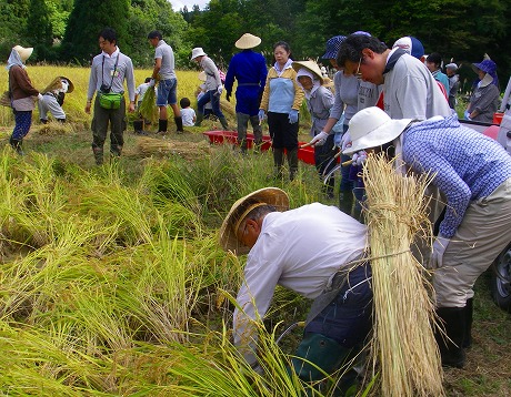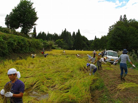 キョロロが栽培している極低農薬生物多様性米「雪里のキョロロ米」の収穫が6日に無事終了しました。参加者は、イベント申込者の他に、地元の方々がたくさん応援に来てくださいました。総勢32名の方々により、10aの稲を無事刈り取ることができました。ご協力に感謝申し上げます。メダカが泳ぐ水田での稲刈りはなかなか大変でした。バインダーの手助けは借りたものの、昔ながらの手刈りのために時間がかかりました。刈り取り後の慰労会では、新米の魚沼コシヒカリをぬか釜で炊きあげおにぎりにして戴きました。はさ掛け天日干しのコシヒカリができあがりましたら参加者に精米してお送りします。
