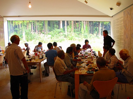 楽しい慰労会です。新米のぬか釜で炊いたおにぎりがとてもおいしかったです。地元の料理もたくさんありました。お土産に山の幸であるクリ、アケビなどもあり参加者はびっくりです。
