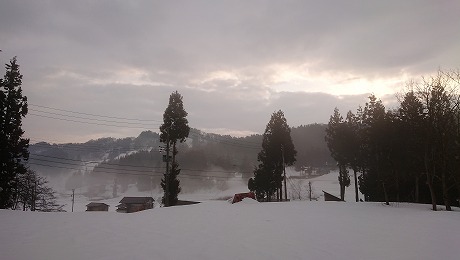 今朝の雪里は、川霧に包まれていました。この二日間は気温があまり上がらず、積雪量の減り方は少なかったです。