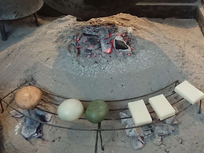 キョロロでは今日から地炉が開設されます。地炉には炭火が入り、串餅、あんぼ、甘酒などを食することができます。